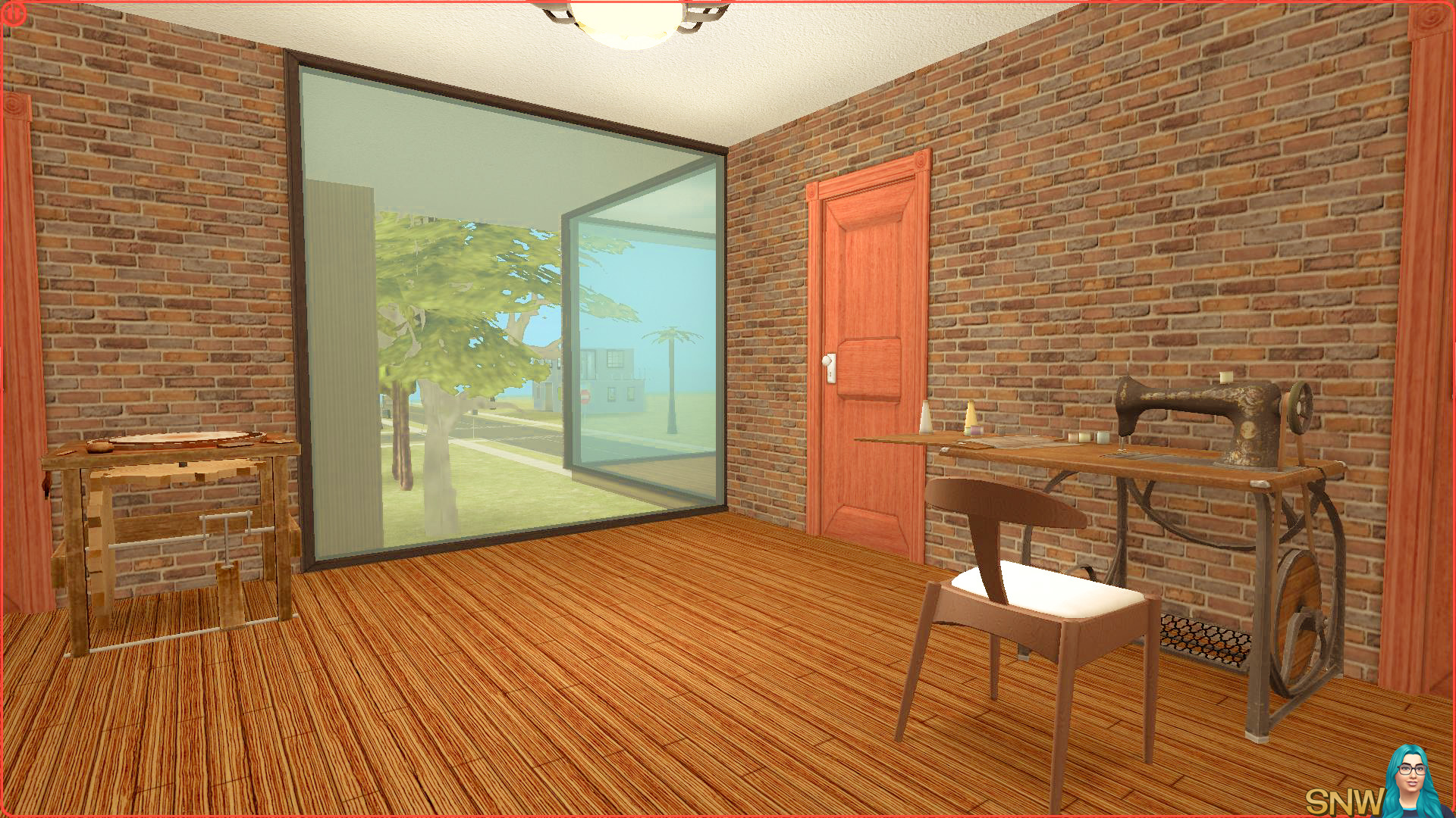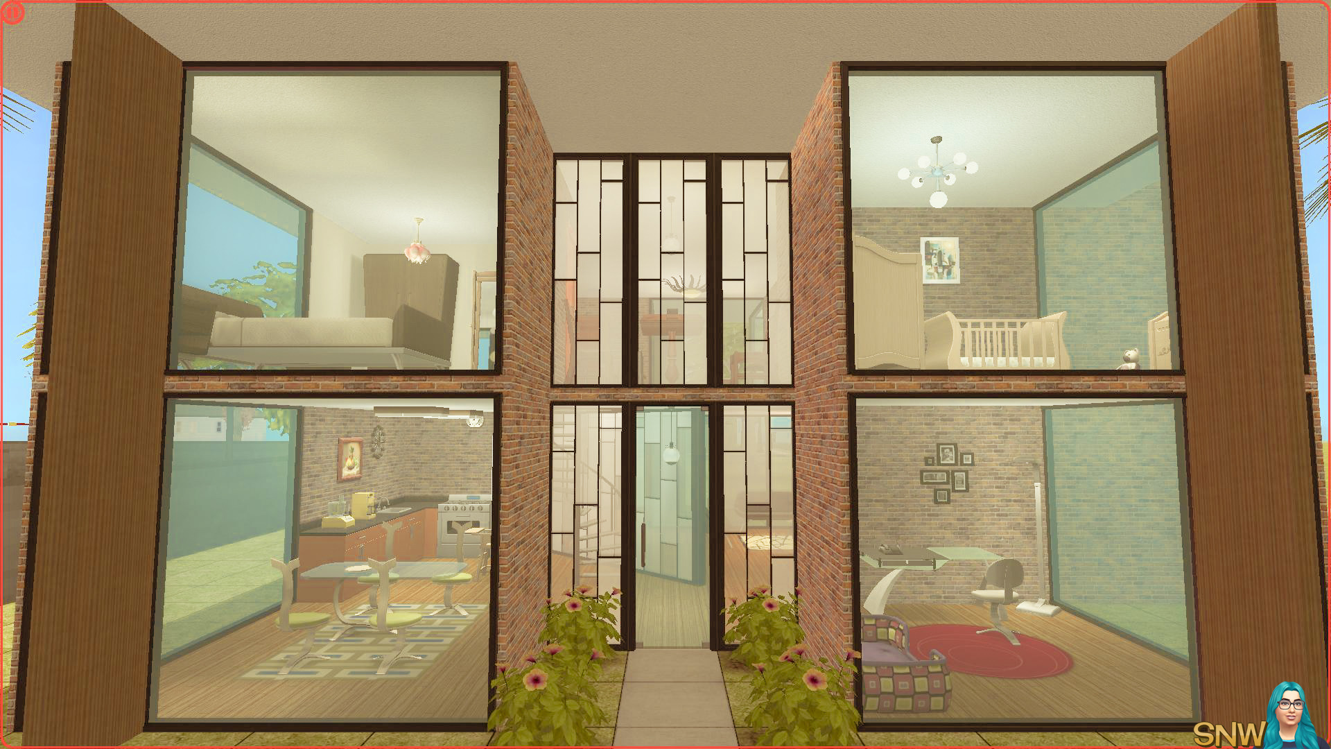 Deze mid-century woning heeft geen echte gang. Je komt direct het huis binnen en hebt dan de keuken en het eetgedeelte aan de linkerzijde, een klein kantoortje aan de rechterzijde, en als je rechtdoor gaat kom je in het woongedeelte terecht. Het is allemaal open, hoewel sommige ruimtes wel gescheiden zijn door coole ramen. De woonkamer heeft een driezitter en twee tweezitters, een open haard, een salontafel, een krabpaal en twee boekenkasten. Het kantoortje heeft een bureau met telefoon (geen computer, want tja, mid-century lol), en een grote mand voor huisideren in de hoek. De keuken heeft alle benodigdheden, een eetgedeelte voor 4 Sims en een kinderstoel. Er is tevens een entertainmenthoekje achterin de woning met daar een piano, een schildersezel en wat speelgoed voor peuters. Het toilet beneden heeft een toilet, wastafel met spiegel en een kattenbak. Ja, het is een diervriendelijk huis. Want buiten voor het huis staat ook een hondenhok. Achteraan op het kavel staat ook een telescoop. Kom maar op met die aliens!
