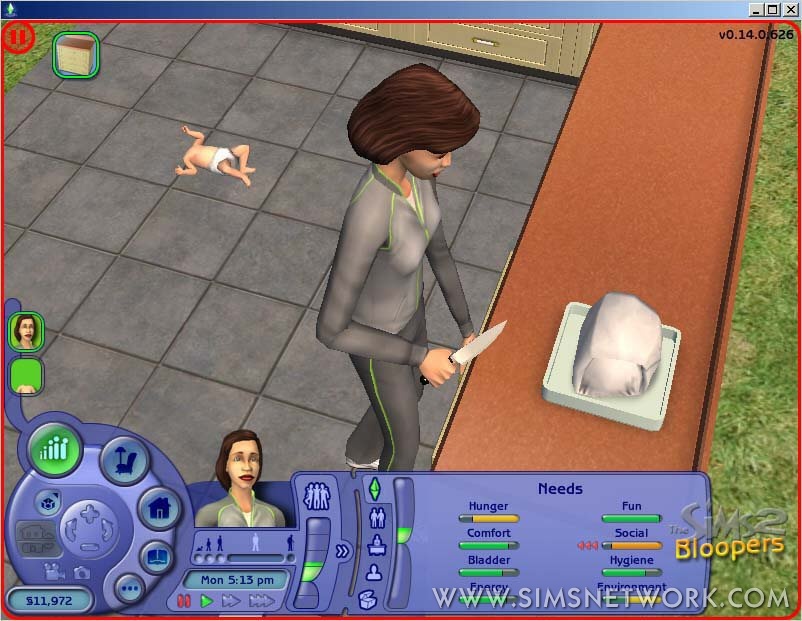 The process of creating a video game is a long and arduous journey, filled with its fair share of aggravation, frustration, and headaches. But the great thing about creating a thoroughly modern video game like The Sims 2, apart from being able to play it when all's said and done, is that the technology behind it has become so complex that truly bizarre and hilarious things can happen in the game when even the tiniest of things go wrong. Usually, when we encounter bugs in the game, it's no fun at all. The game grinds to a halt, or crashes, and we all pop a couple of aspirin, roll up our sleeves, grab our caffeinated beverage of choice and prepare for the hard slog necessary to fix the problem, but occasionally the results surprise us all. Throughout this process, we've been constantly compiling and playing new builds of the game, and especially early on in the process, they would each have their own set of quirks – their own "flavor". Different builds, if they break just so, can put a smile on the face of the whole team. The team member who makes the discovery will take a snapshot of the screen and it gets passed around, to the momentary delight of everyone else. Then we all grimly set about finding, and squashing the buggy culprit.