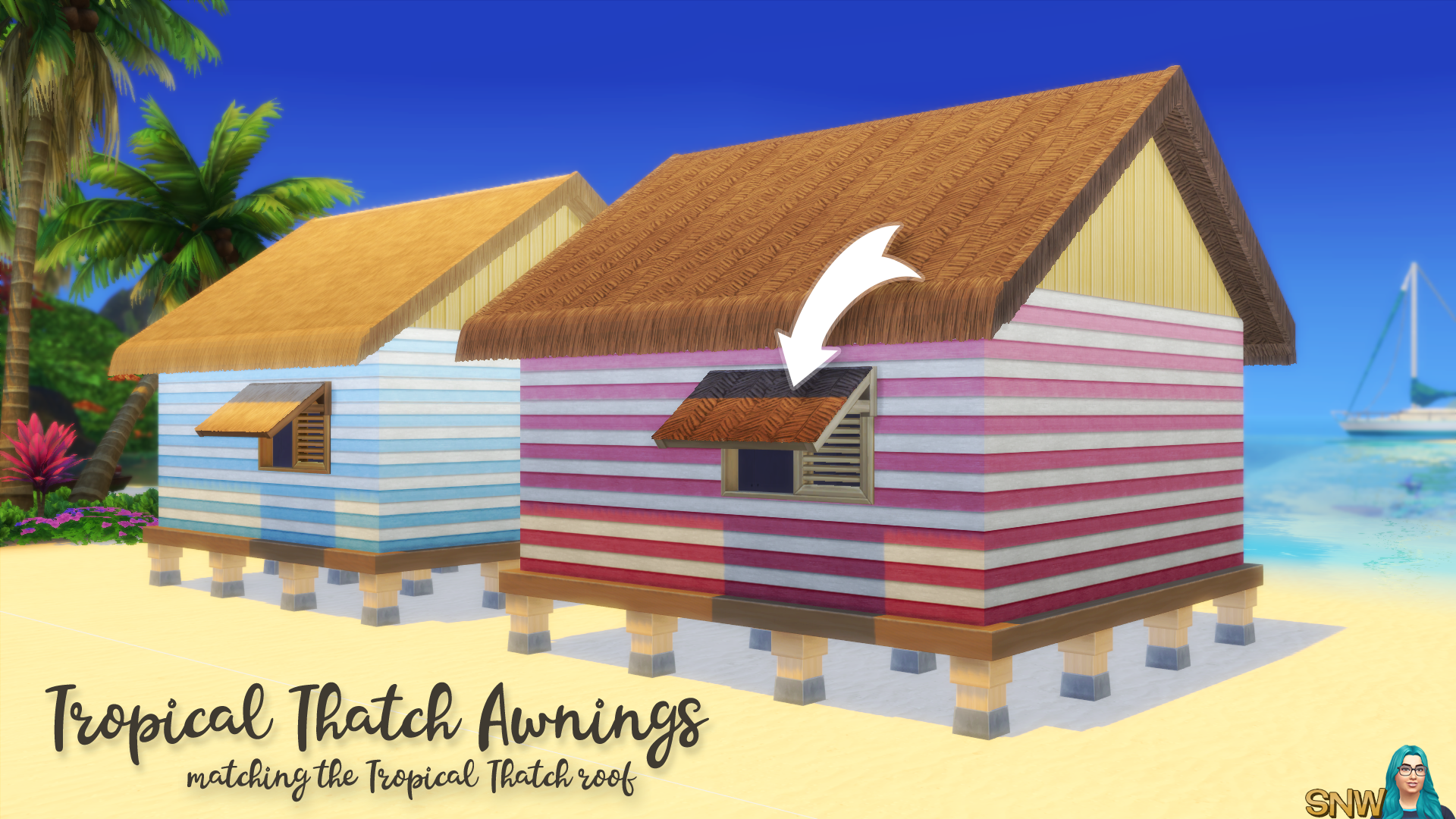 The Sims 4: Island Living is pretty amazing. As a builder I really love all the new build and buy items. But there are a few things I thought were missing. There is a matching awning for the Shingle Thatch roof. But there was none for the Tropical Thatch roof. I fixed that. Now you can have a matching awning to go with both tropical roof styles. Yay!