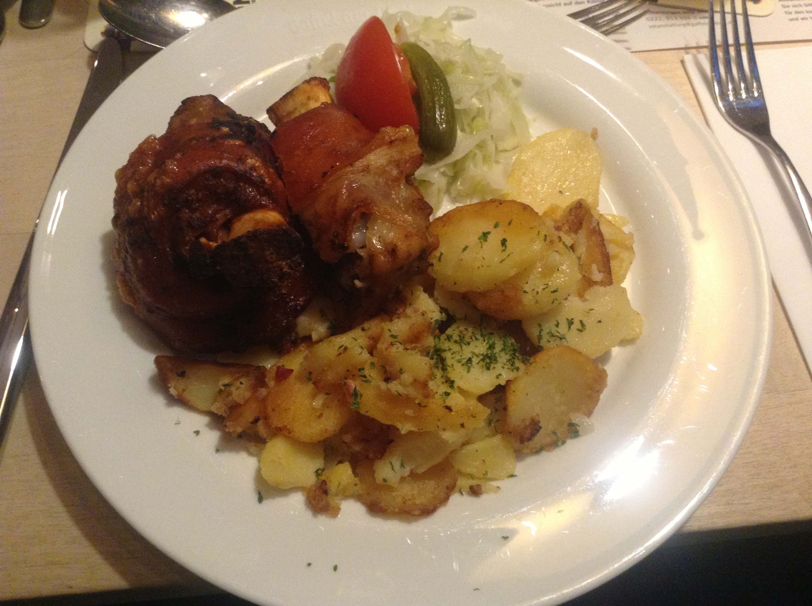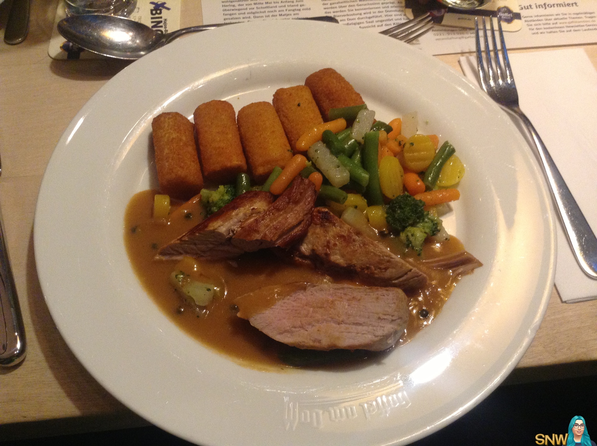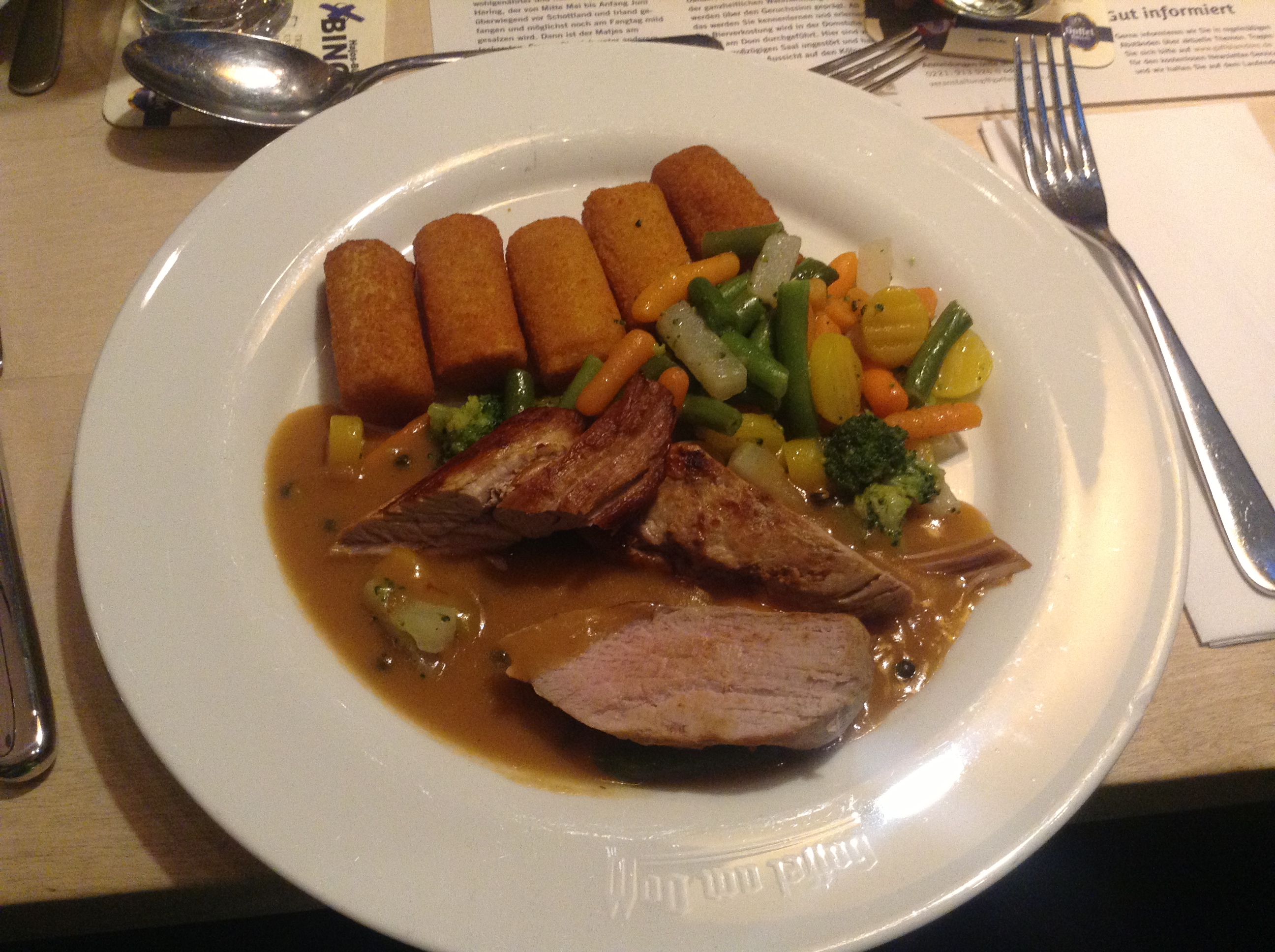Dit was het tweede gerecht dat ik kreeg. Hoewel het er lekker uitzag, voelde ik me niet heel erg prettig erbij in verband met de aardappelkroketjes en de jus, aangezien daarin gluten zitten. En ik wil tijdens een belangrijke week als deze geen risico lopen!