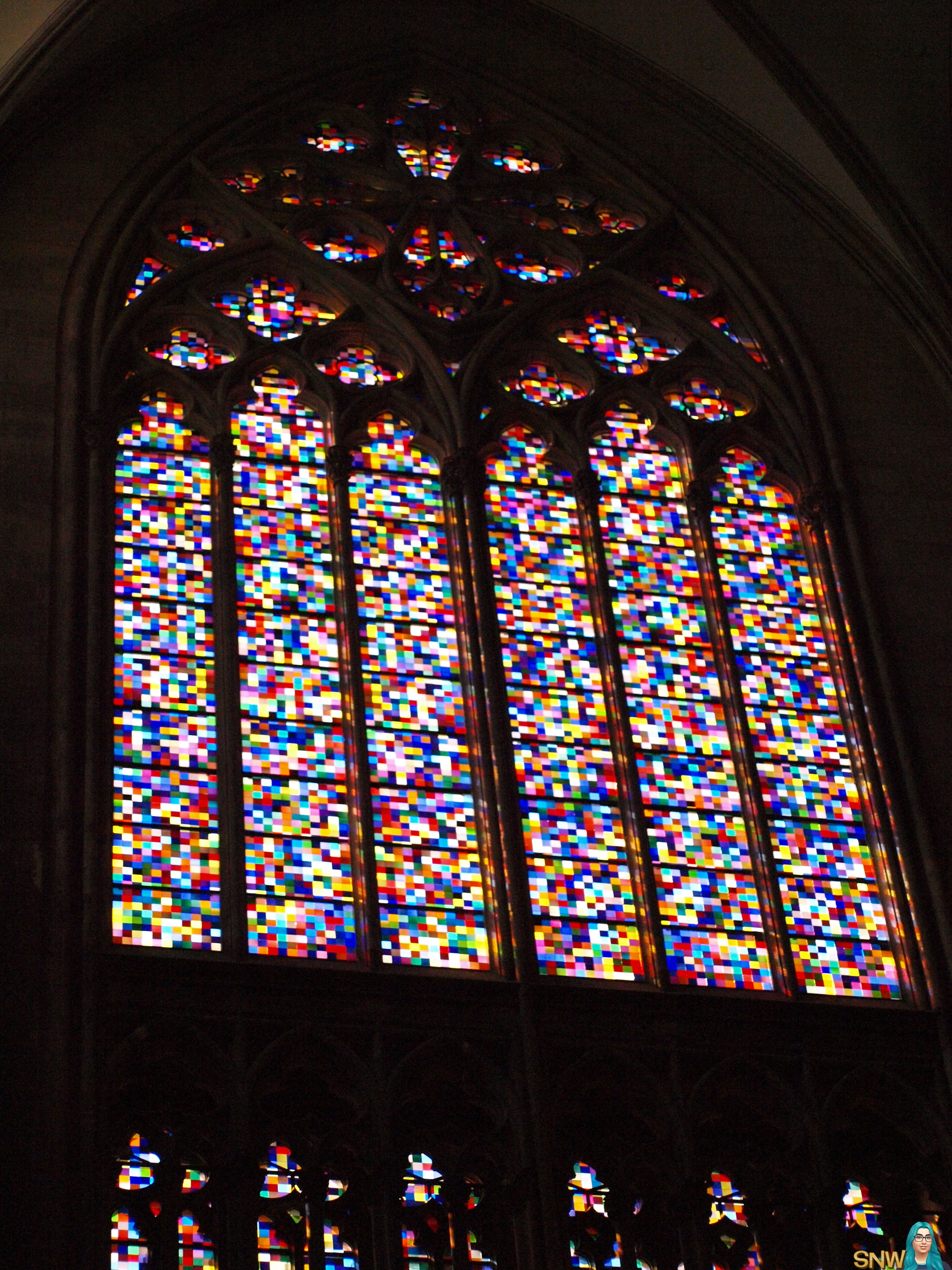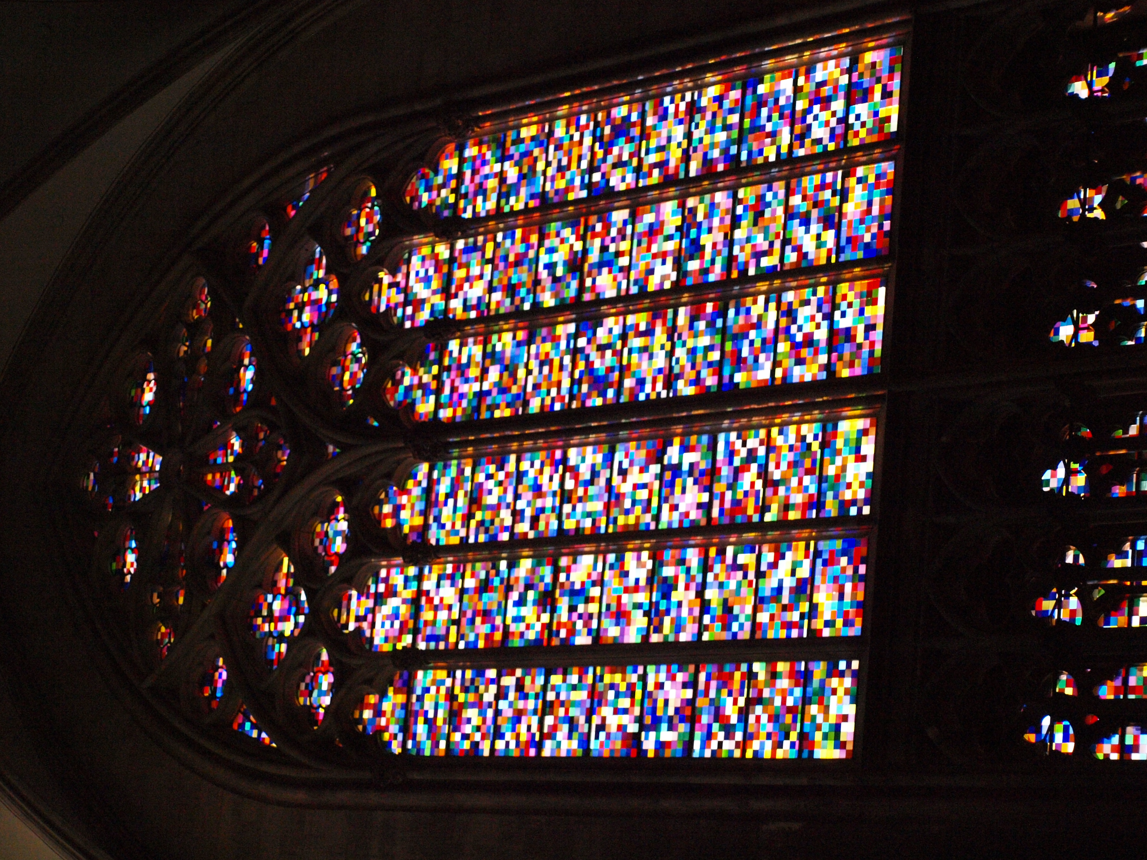 En in de Dom hebben we veel dingen geleerd. Maar een van de dingen die ik bijzonder interessant vond was dit moderne raam. Het was ontworpen/gemaakt door Gerhard Richter, en het ziet er voor mij uit als een heleboel pixels. En de panelen zijn tevens symmetrisch. Kijk maar eens!